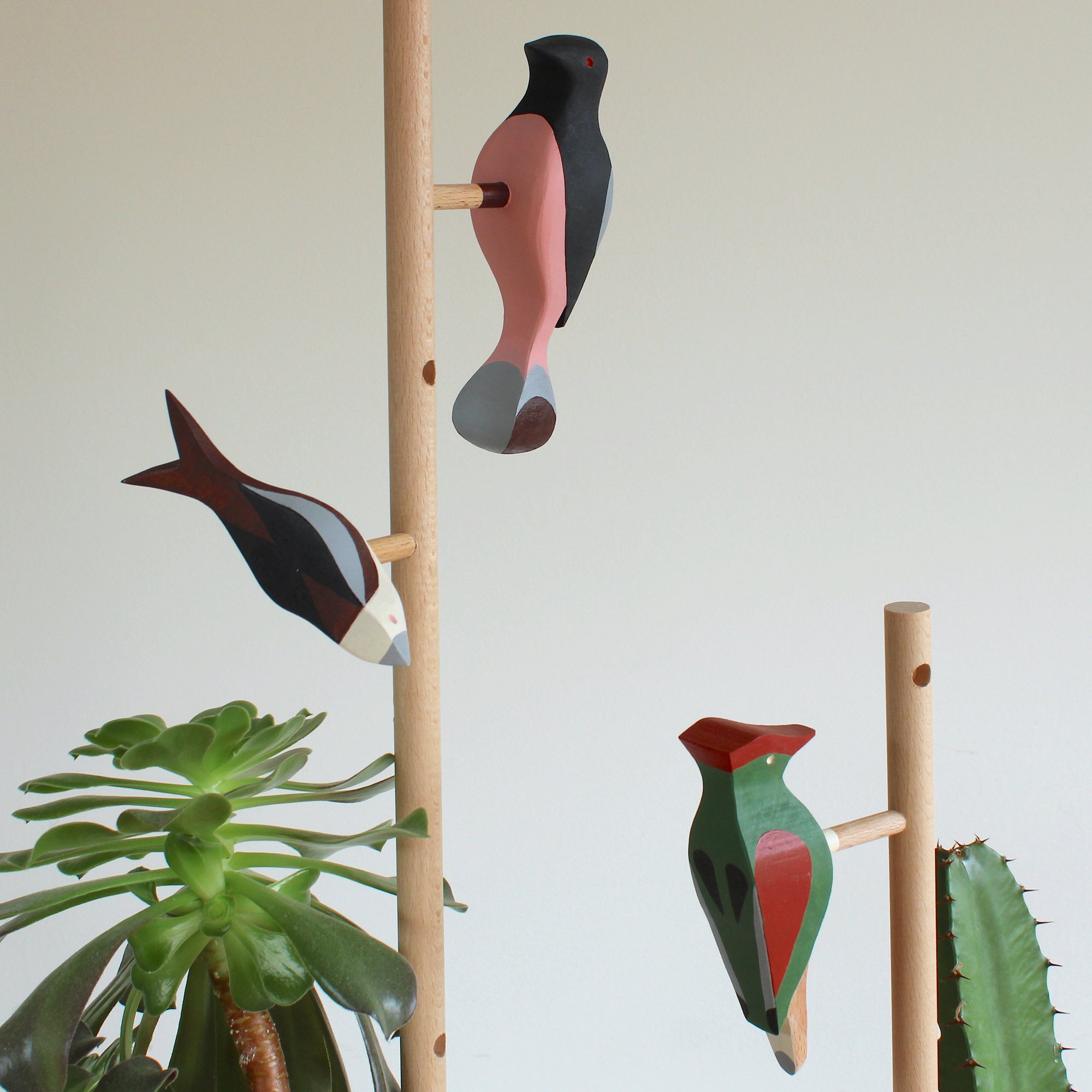 Pack of 3 wooden birds hand-carved and painted by Valerio Vidali